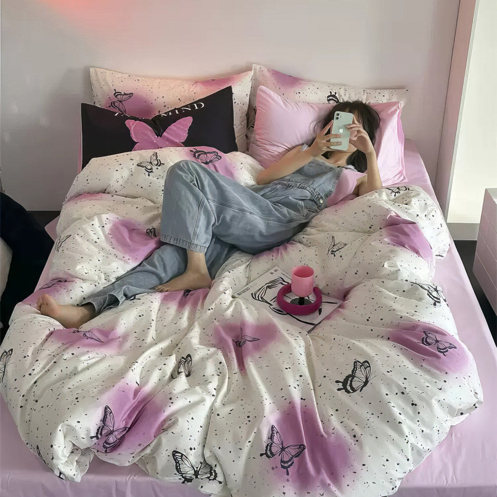 Podnieś estetykę swojej sypialni na wyższy poziom dzięki tej pościeli z motywem vintage motyli w stylu y2k. Idealnie wpasuje się w pokoje utrzymane w estetyce y2k, coquette, cottagecore oraz wielu innych modnych stylach.