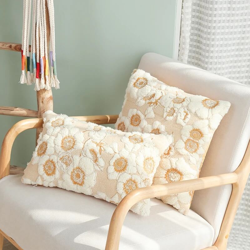 Estetyczna poszewka na poduszkę z puszystym, haftowanym wzorem vintage dzikich kwiatów na całej wierzchniej stronie dekoracyjnej poduszki. Wykonana z gęstej, grubej tkaniny bawełnianej. Idealna do pokojów w stylu coquette, boho lub każdej aranżacji inspirowanej kwiatami.