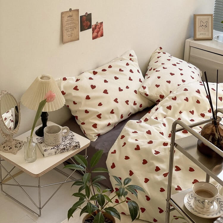 Podnieś estetykę swojej sypialni na wyższy poziom dzięki tej pościeli z motywem małych, vintage'owych czerwonych serduszek. Zestaw idealnie sprawdzi się w pokojach w stylu cottagecore, coquette i wielu innych estetycznych aranżacjach.