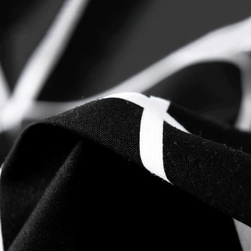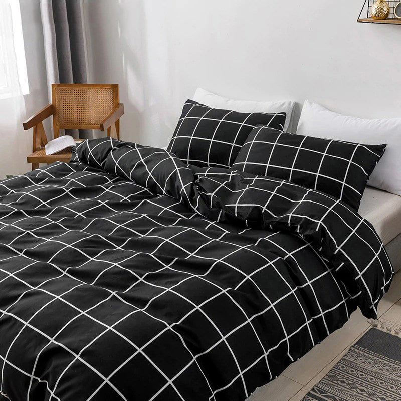 Trzyczęściowy zestaw pościeli z poszewką na kołdrę, ozdobiony cienką białą kratką na czarnym tle. Idealny do sypialni w stylu indie/kidcore/grunge. Doskonale komponuje się z gładkim prześcieradłem w kolorze białym, szarym lub czarnym.